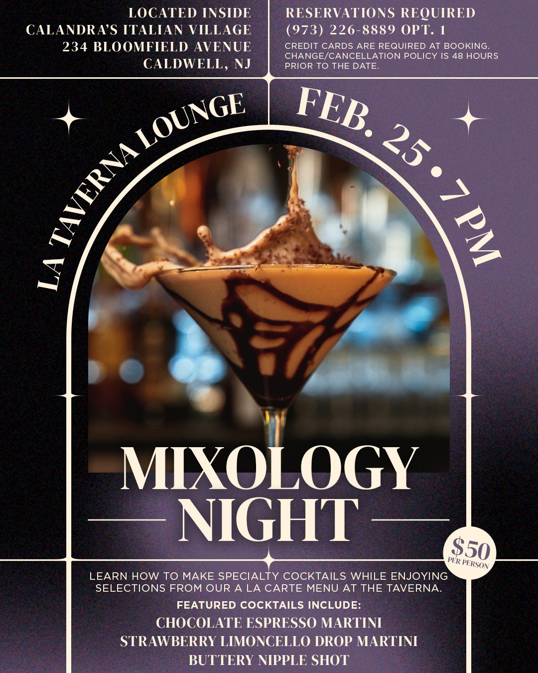Learn how to make specialty cocktails while enjoying selections from our a la carte menu at the Taverna.