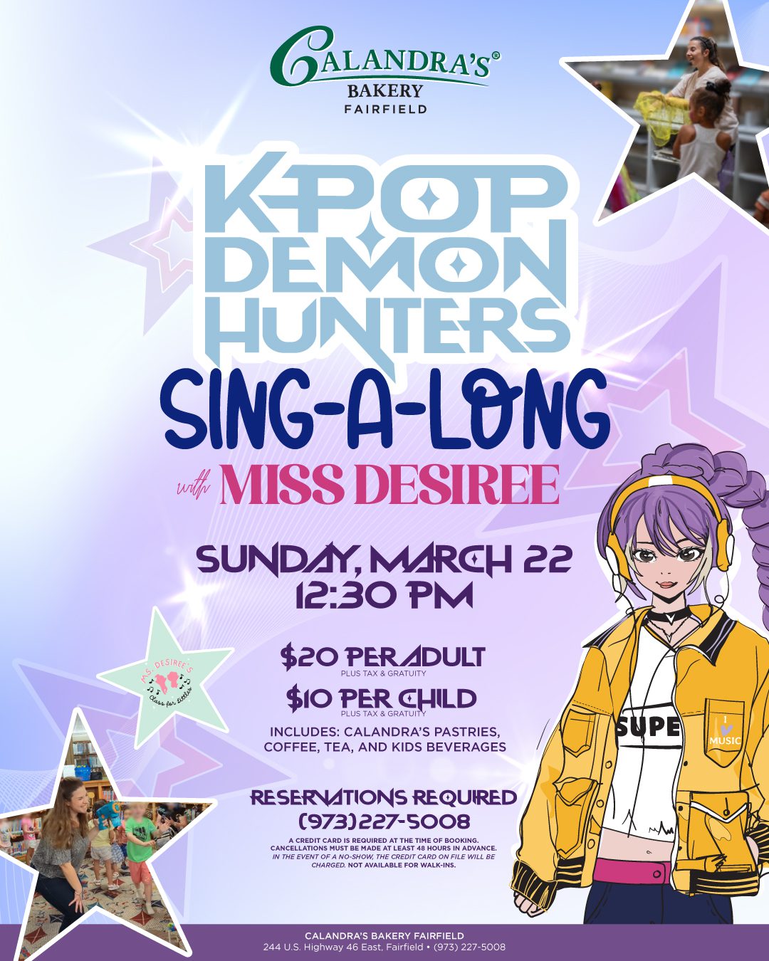 Join Miss Desiree for a fun and interactive musical performance with your favorite songs from the Broadway Musical and Cinema Phenomenon, Wicked. In this 45-minute experience, children and adults will follow in a guided sing-along while enjoying Calandra’s pastries. Shake your Scarves to Popular. Move your body and your tambourine while we’re Dancing Through Life. Experience the magic of bubbles while we’re Defying Gravity. Recommended for all ages, so bring the whole family!