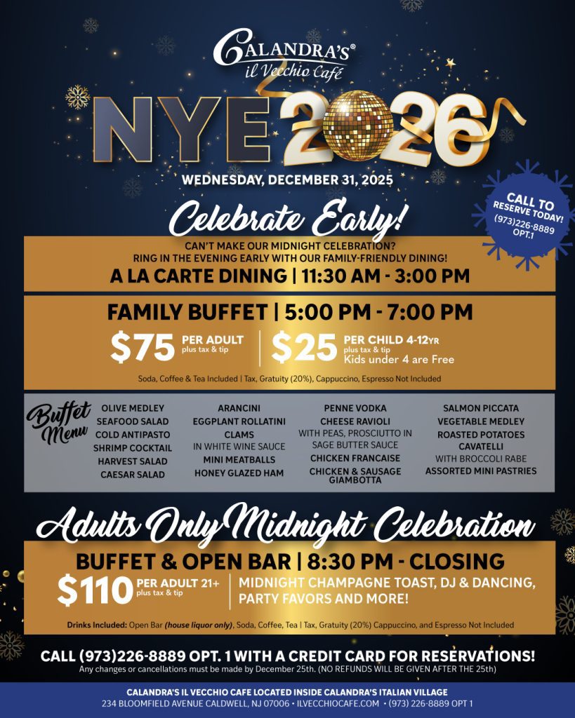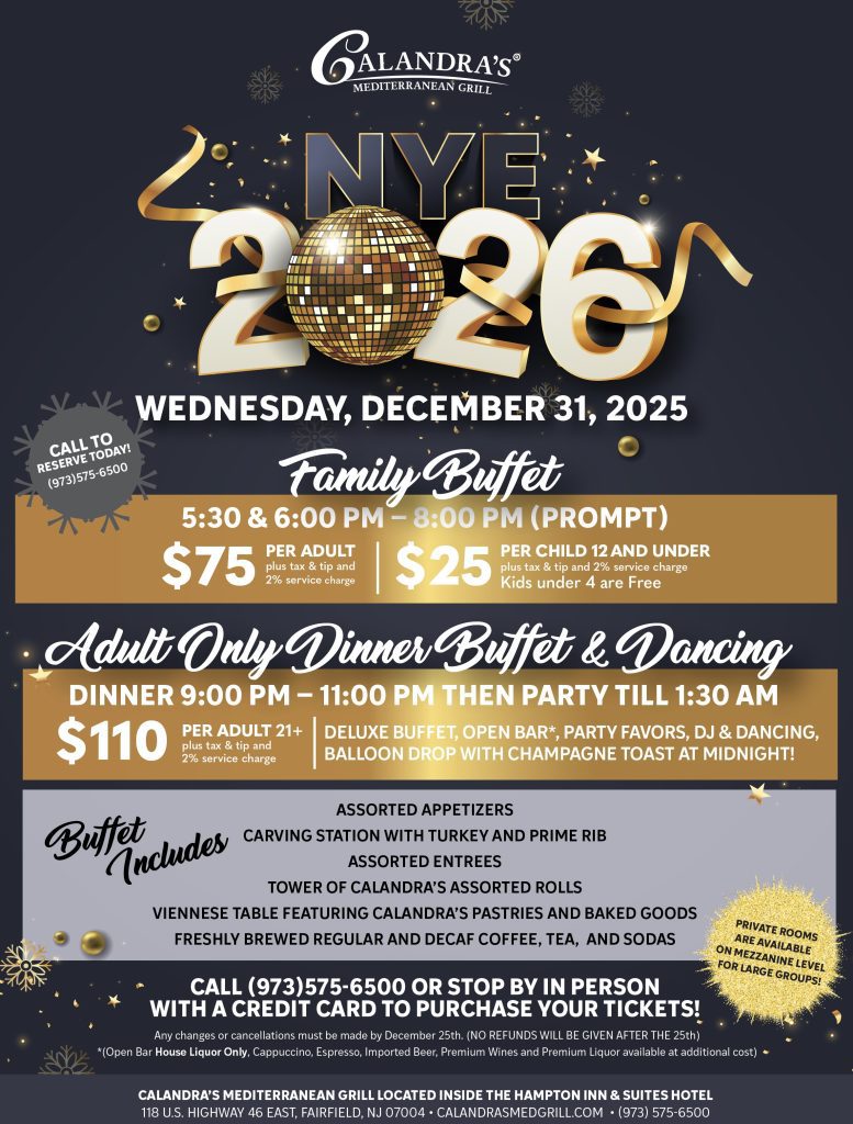 Call toreserve your table today! (973)575-7720! Any changes or cancellations must be made by December 25th. (NO REFUNDS WILL BE GIVEN AFTER THE 25th)